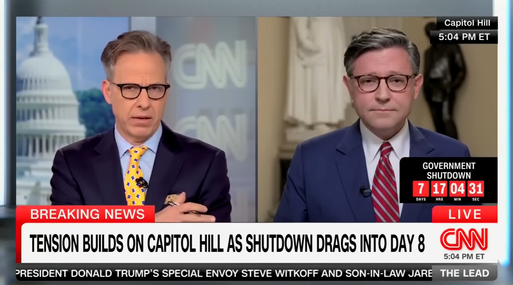 WASHINGTON — This evening, after Senate Democrats rejected the clean, short-term, nonpartisan continuing resolution to fund the government for the sixth time, Speaker Johnson joined The Lead on CNN, Balance of Power on Bloomberg TV, and Hannity on Fox News to discuss the government shutdown’s harmful effects on everyday Americans. Speaker Johnson also addressed Israel and Hamas agreeing to the first phase of President Trump’s historic peace plan.